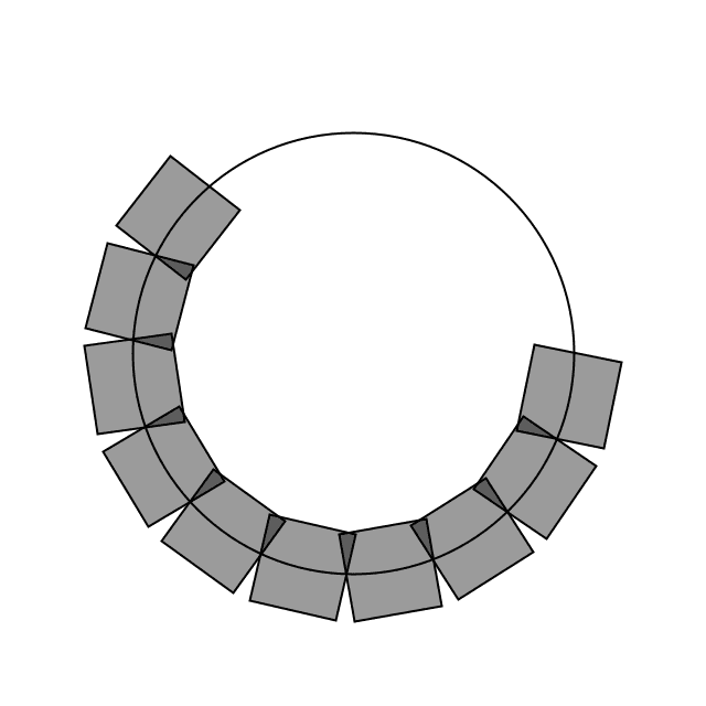 The character by character method also allows us to display text along a curve. Before we move on to letters, let's first look at how we would draw a series of boxes along a curve. This example makes heavy use of trigonometry.